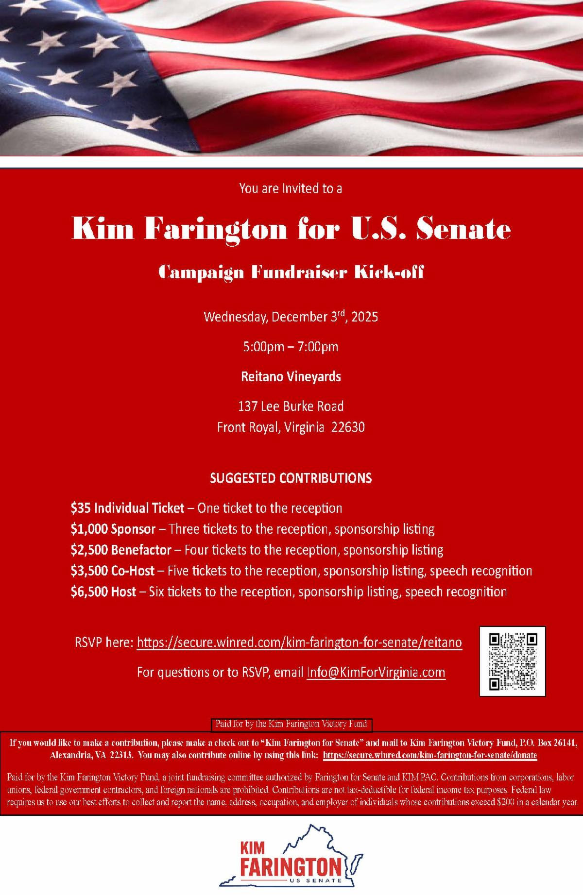 Kim Farington for US Senate is hosting a fundraising reception tomorrow, Wednesday December 3, from 5:00-7:00pm at Reitano Vineyards, 137 Lee Burke Road, Fort Royal, 22630. Tickets are $35 and sponsorships are available. RSVP here.