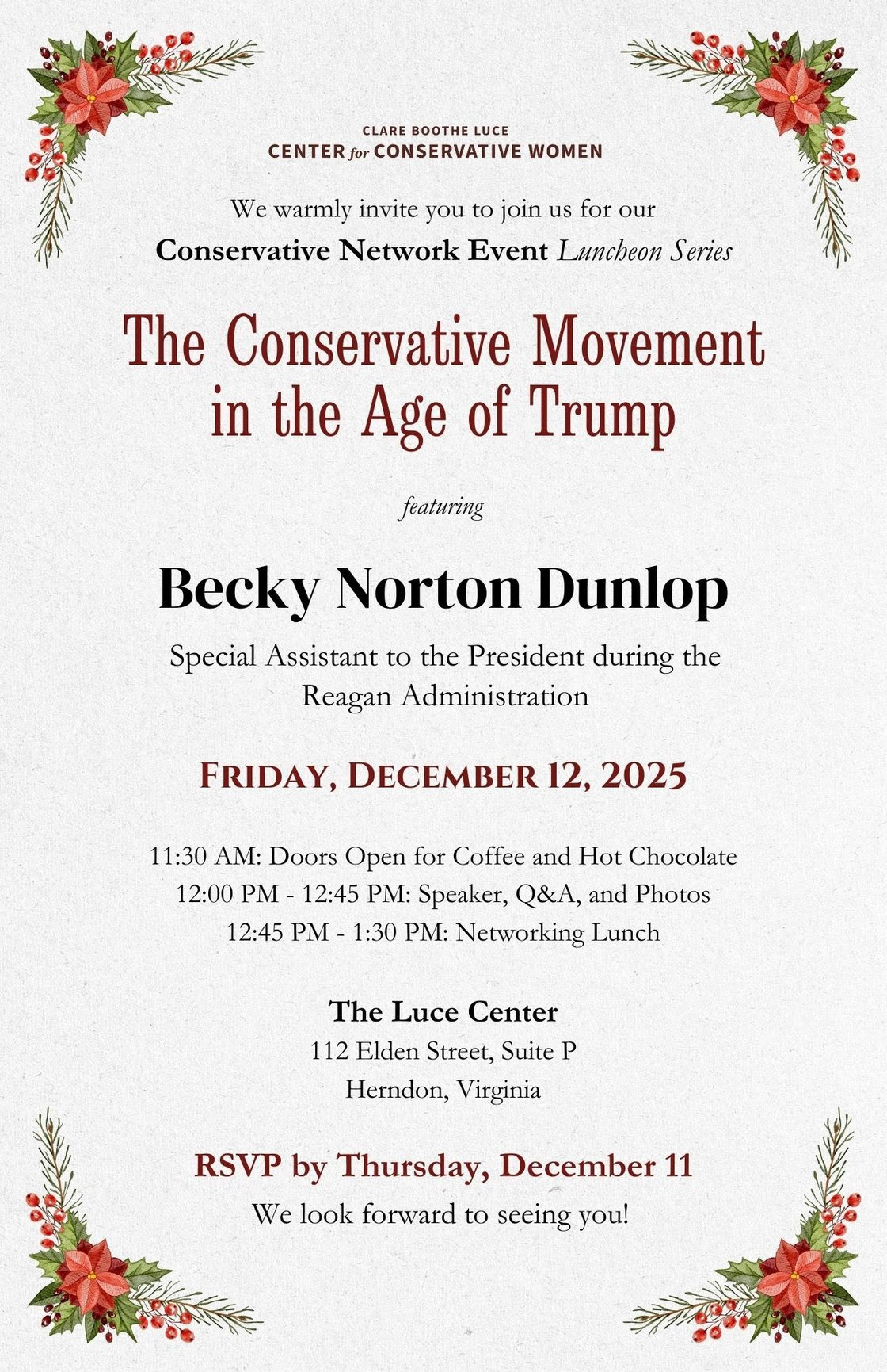Join the Clare Boothe Luce Center for Conservative Women for a Conservative Network Event on Friday, December 12 at 11:30am. The guest speaker will be Becky Norton Dunlop, former Special Assistant to the President under President Ronald Reagan, speaking on the topic of The Conservative Movement in the Age of Trump. It will be held at the Luce Center, 112 Elden St., Suite P, Herndon. Please RSVP by December 11 online here.