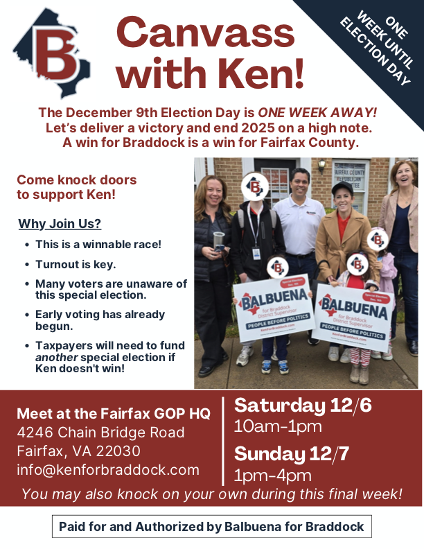 The special election for Braddock District Supervisor is just one week from today, on Tuesday, December 9. GOP candidate Ken Balbuena is running to replace Democrat Supervisor James Walkinshaw, and early voting is happening NOW through this Saturday, December 6 at the locations below:
