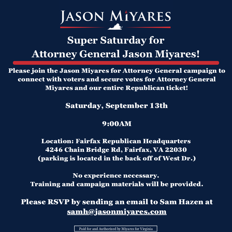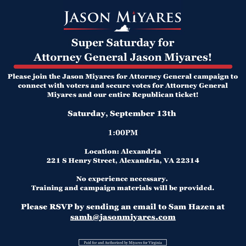 • Saturday door knocking for Jason Miyares Sat., Sept. 13