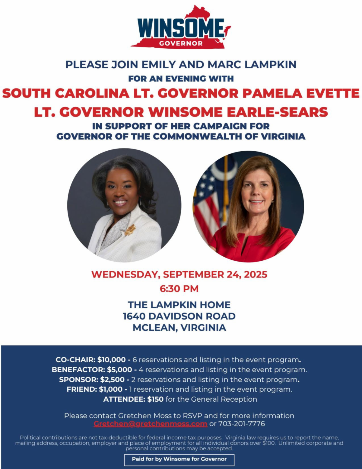 Come support GOP gubernatorial candidate Winsome Sears at an evening event with special guest Pamela Evette, the Lieutenant Governor of South Carolina, on Wednesday, September 24 at 6:30pm at the home of Emily and Marc Lampkin, 1640 Davidson Road, McLean. RSVP to Gretchen at Gretchen@gretchenmoss.com.