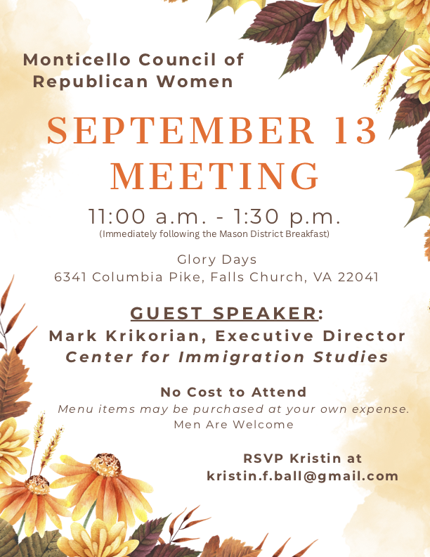 Join the Monticello Council of Republican Women for their next meeting this Saturday, September 13 from 11:00am to 1:30pm at Glory Days Grill, 6341 Columbia Pike, Falls Church 22041. The guest speaker will be Mark Krikorian, Executive Director of the Center for Immigration Studies. There is no cost to attend; you may purchase meal items from the menu at your own expense.