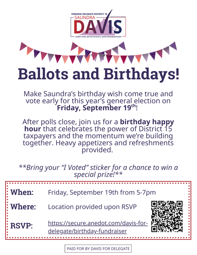 House of Delegates candidate Saundra Davis (HD-15) is celebrating her birthday on Friday, September 19 from 5:00-7:00pm and you are invited! RSVP here. Address provided upon RSVP.
