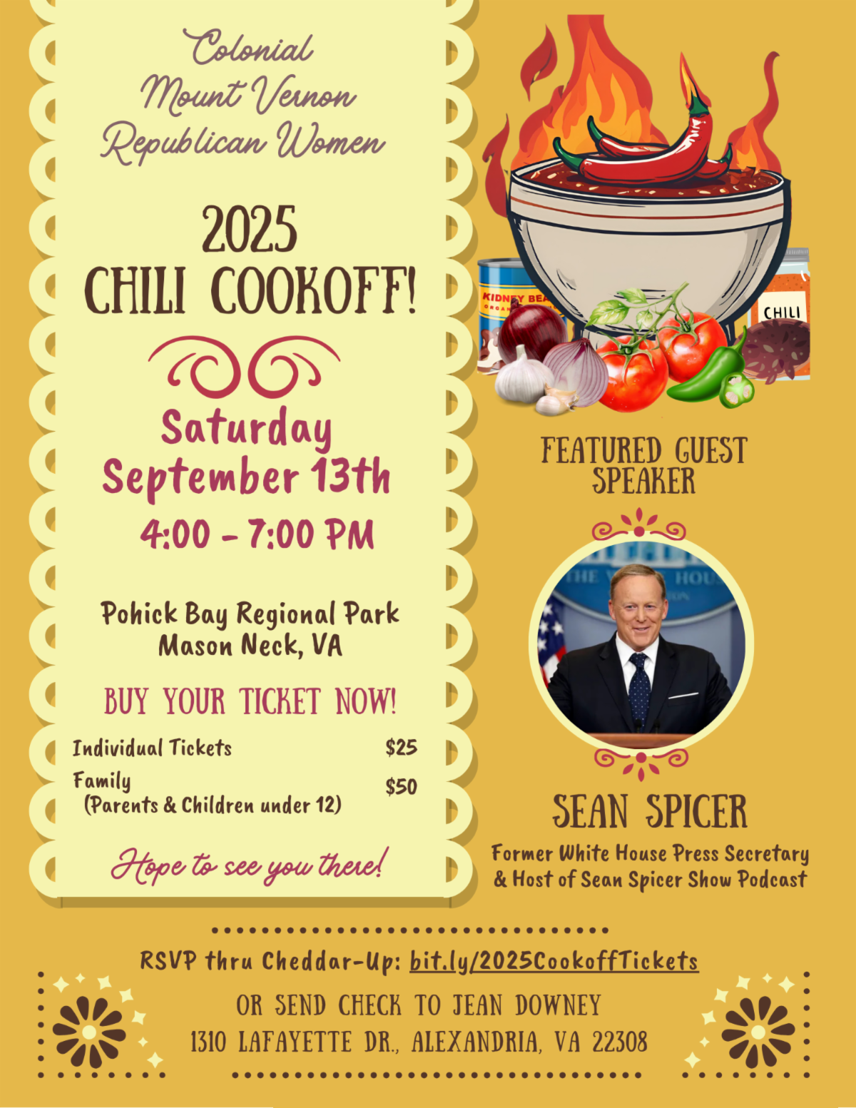 You’re invited to the Colonial Mt. Vernon Republican Women’s Club annual chili cookoff on Saturday, September 13 from 4:00-7:00pm at Pohick Bay Regional Park in Mason Neck. Tickets are $25 for individuals and $50 for families. The special guest will be former presidential press secretary Sean Spicer.